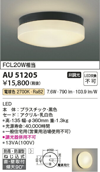 FCL20W相当LED本体:プラスチック・黒色セード:アクリル・乳白色●高-135 幅-φ360mm 重-1.3kg●消費電力:7.6W●定格光束:790 lm●固有エネルギー消費効率:103.9 lm/W●演色性:Ra82●色温度:2700K●光源寿命:40000時間●直付・壁付取付●傾斜天井に取付可能(90°まで)●一般住宅用(営業用浴場使用不可)●絶縁台不要●調光器併用不可●13VA(100V)※取付には電気工事が必要です。