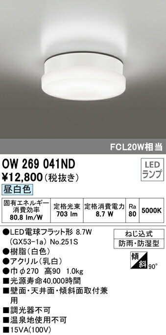 昼白色光束:703lm消費電力:8.7WRa805000KLED電球フラット形8.7W(GX53-1a)No.251S樹脂(白色)アクリル(乳白)巾φ270・高90・1kg壁面・天井面・傾斜面取付兼用調光器不可温泉地使用不可15VA(100V)ねじ込式防雨・防湿型傾斜取付90°可能【LED照明】 【昼白色】 【防雨】 【防湿】検索用カテゴリ9